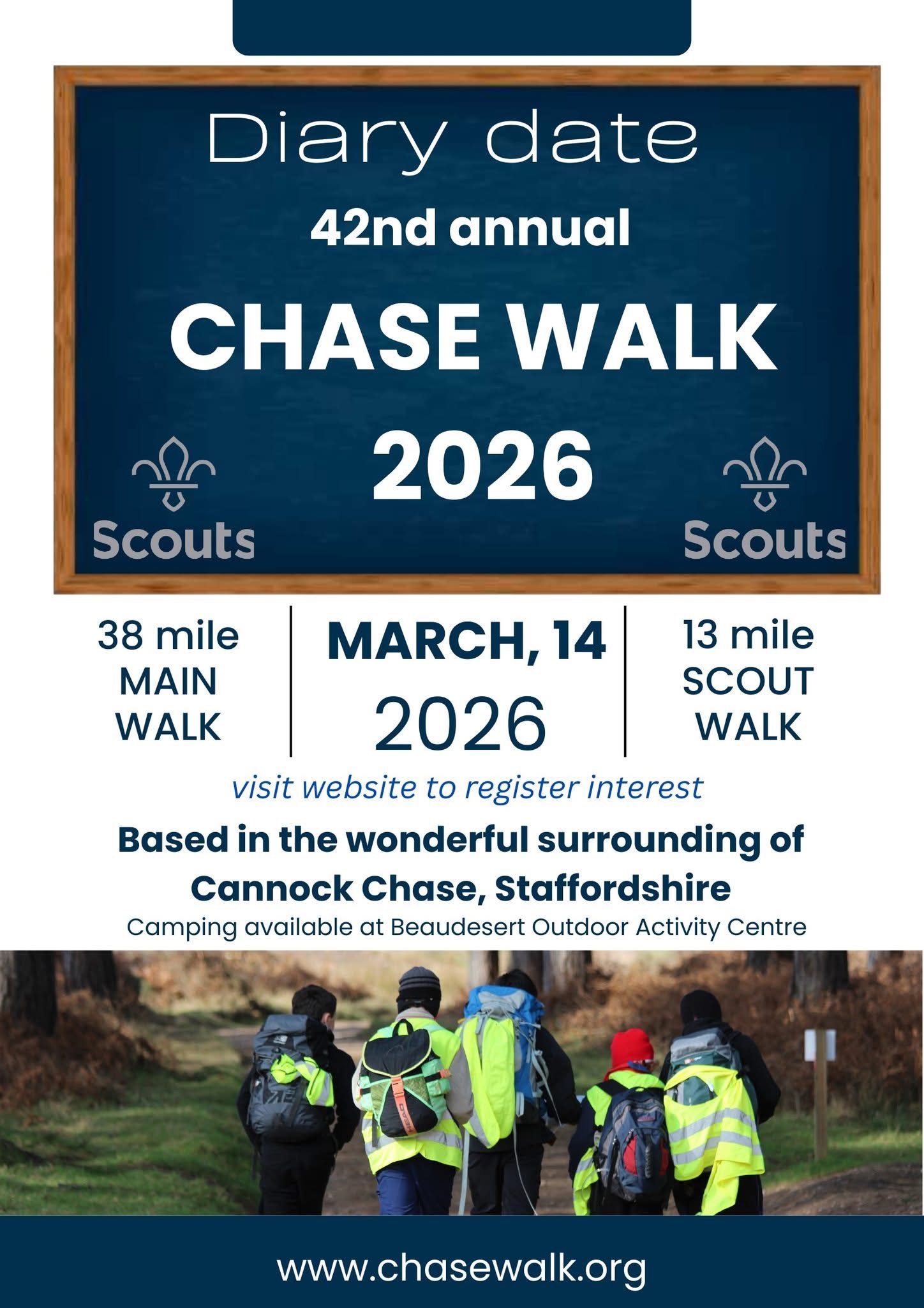 The Chase Walk is a 38.2 mile competitive walk over and around Cannock Chase in Staffordshire, England. The walk is for teams of four to seven people, and takes place annually in March. It is organised by members of the Nationwide Scout Communications Team and supported by an invaluable network of Groups and Supporters without who’s help...